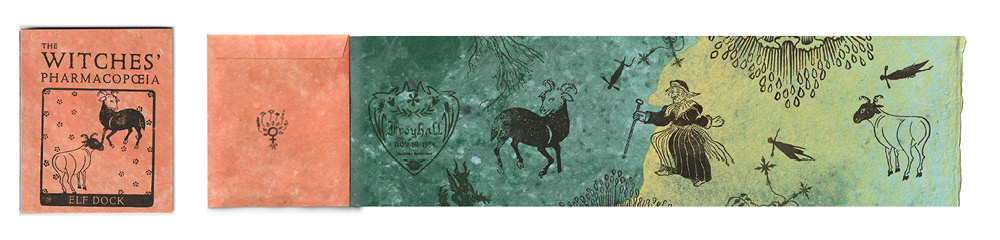 The Witches’ Pharmacopoeia: All-Heal (Yarrrow), 2022, ink on handmade paper (abaca, cotton, pigment) 4x4.75x.75 inches (closed), 16x4.75x4.5 inches (expanded). Edition of 7.